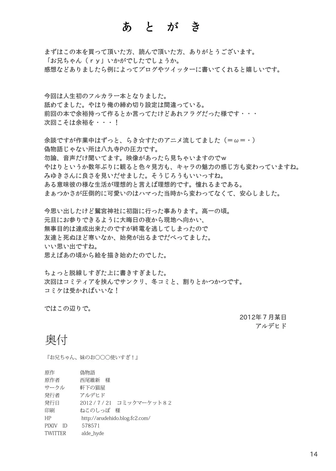 (C82) [Nokishita no Nekoya (alde hyde)] Oniichan, Imouto no O*** Tsukaisugi! (Bakemonogatari)