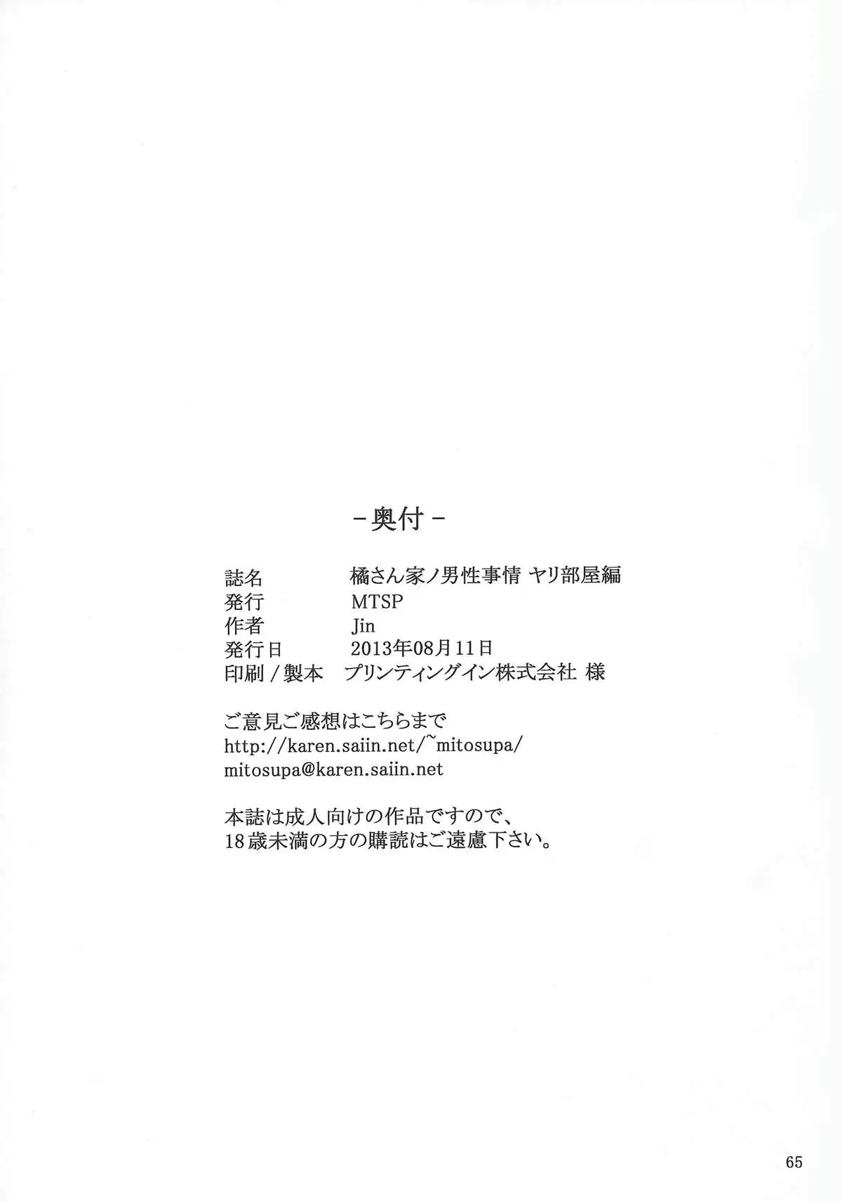 Watch (C84) [MTSP (Jin)] Tachibana-san-chi no Dansei Jijou Yaribeya-hen (C84) [MTSP (Jin)] 橘さん家ノ男性事情 ヤリ部屋編