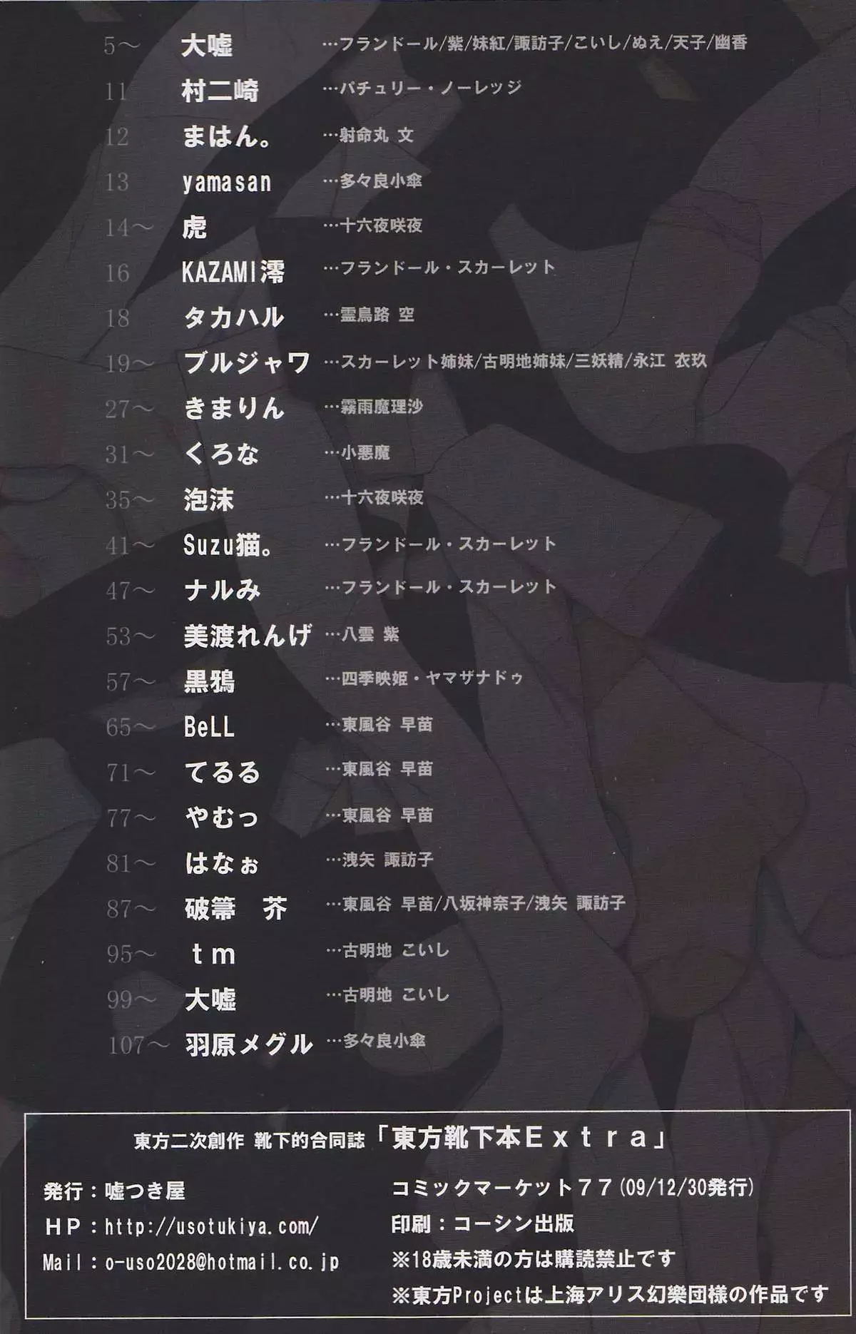 Watch (C77) [Usotsukiya (Various)] Touhou Kutsushita Bon Extra (Touhou Project) (C77) [嘘つき屋 (よろず)] 東方靴下本Extra (東方Project)